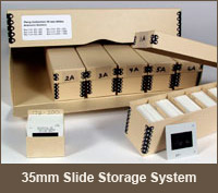 Finally, the 35mm slide storage system, made entirely from archival-grade boxboard, will be useful for collectors who need to hold a large number of slides. It comes with boxes that can hold either 200 cardboard-mounted slides or 100 glass-mounted slides, as well as eight trays that hold up to 25 cardboard-mounted slides. All of these separate enclosures are kept within a drop-front box that, all told, can hold as many as 1,200 cardboard-mounted or 600 glass-mounted slides.