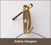 Safety hangers are simple to use. They will help defer the theft of one's frame piece (especially in public places) or from falling off the wall during a small earthquake or should bump. The hangers are brass plated with a knurled head steel nail. The spring loaded clip traps the hanging wire in a closed loop preventing it from upward motion. Use two hangers for heavier frames or when keeping frames level is a must.